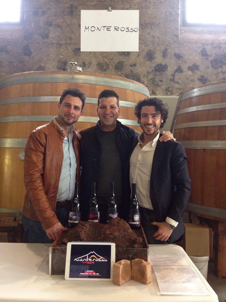 Today, Monterosso is coming back to life. The vineyard on the slopes of the old crater are being recuperated by three friends who have a passion for Etnaen history and wine—Aurelio Marconi, Giovanni Ferlito, and Gianluca Strano [see photo below, names in order, L to R]. Using ancient and modern methods, Monterosso Wine produces four wines from native Etna grape varieties on one of Etna’s most unique “pet craters.”